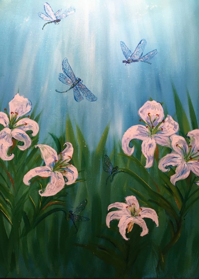 Dragonfly and Flowers Painting 16” x 20” by Chris – SOLD COMMISSIONED PAINTING